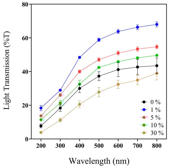UV–Vis spectra profile (200–800 nm) of 0, 1, 5, 10, and 30% w/v IP188 membranes. Transmission values expressed in mean ± SD, n = 3.