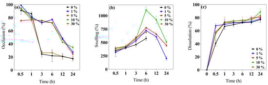 This study evaluated the 0–30% w/v IP188 membrane occlusion for the in vitro permeation at different periods. The results (Figure 3a) indicated that the 1, 5, and 10% w/v IP188 membranes presented higher occlusive factors (72.05 ± 3.06%, 75.57 ± 0.96%, and 73.38 ± 1.04%, respectively) than the 0 and 30% w/v IP188 membranes and were decreased regarding time; this effect was related to the porosity index, less porosity, and increased occlusion. On the other hand, the materials with a 21.05 ± 5.26% and 22.70 ± 3.22% occlusion were constant regarding time (3–24 h). In our formulations (1, 5, and 10% w/v IP188 membranes), as the pores were coated, the lower the porosity, the higher the occlusive factor, the higher the contact angle, and the lower the water vapor transmission rate. The water vapor transmission rate (WVTR) was estimated using the water loss method until 24 h after the evaluation (Table 3).