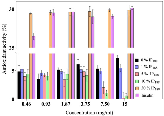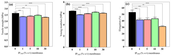 Previous works reported the convenient UV-barrier properties of different biopolymers such as chitosan–polyvinyl alcohol with Mentha spicata L. and Punica granatum ranging between 0 and 12.5% T [62] and calcium–alginate–Aloe vera 0–25% films with UV values ranging between 37 and 75% T [61]. Analyzing the UV light protection capacity of our biopolymeric insulin membranes (0–30% w/v IP188) (Figure 2, Table 2), the values ranged from 3.84 ± 0.65 to 18.32 ± 2.73% at T200nm and 20.53 ± 3.46 to 48.41 ± 1.25% at T400nm. The values indicated that the biopolymeric insulin membranes had lower UV protection properties than the chitosan–polyvinyl alcohol films but similar UV values to the calcium–alginate–Aloe vera films. However, it depends on the UV analyzed range.