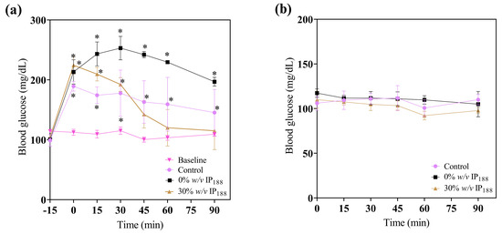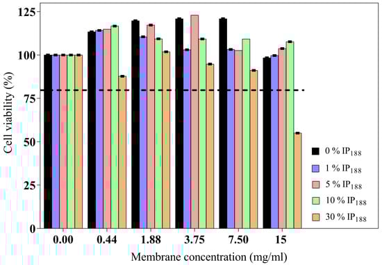When we added insulin and P188 directly at the beginning of the solvent casting method (30% w/v IP188) during gel preparation, the contact angle of the membrane increased from 21.48 ± 1.43° to 25.04 ± 1.59°. The 1, 5, and 10% w/v IP188 membranes presented CA values of Ɵ = 28.82 ± 1.24°, 35.29 ± 1.42°, and 38.23 ± 1.71°, respectively, higher than the 0% w/v IP188 membranes (Ɵ = 21.48 ± 1.43°). The increase in values is due to the low porosity index (Table 3) [70] and the poloxamer content (1, 5, and 10% w/v). The CA value of poloxamer 188 is Ɵ = 56.8 ± 1.8° [71,72]. Thus, the contact angles for the 1, 5, and 10% w/v IP188 increased [61] proportionally to the P188 content (Table 3), possibly due to superficial exposure to poloxamer. The 30% w/v IP188 membranes presented a CA value of Ɵ = 25.04 ± 1.59°, lower than the 1, 5, and 10% w/v IP188 membranes. The difference in CA values is because the formulations of the 1, 5, and 10% w/v IP188 membranes incorporate poloxamer after the solvent-casting through absorption due to swelling, while the 30% w/v IP188 membranes incorporate it at the beginning of the solvent-casting process, even when these membranes presented high poloxamer concentrations. The values were accorded with a hydrophilic surface [68] of biodegradable natural polymers such as chitosan film-loaded CuS nanoparticles with polyphenols extracts (Ɵ = 36.9°–53.7°) [73] and alginate reticulated with Ca2+ (Ɵ = 42.2°) and loaded with 25% (w/v) Aloe vera films (Ɵ = 30.3°) [61].