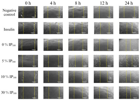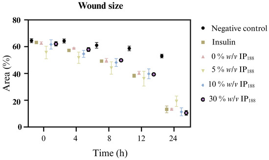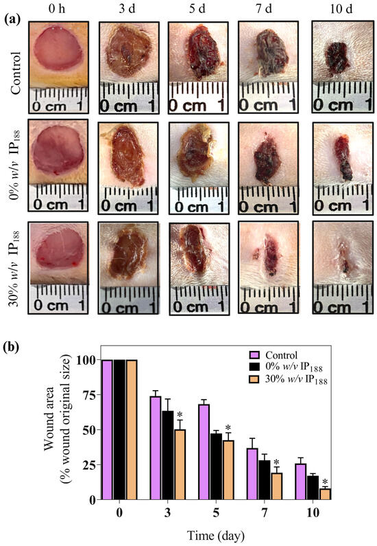 The rats were randomly divided into control, 0% w/v IP188, and 30% w/v IP188. The rats were anesthetized with ketamine (100 mg/kg i.p.) and xylazine (5 mg/kg i.p.). After anesthetization, shaving, and sterilization, two full-thickness wounds (10 mm in diameter) were meticulously created on each side of the rats’ backs to ensure consistent and controlled injuries for the study. The control group received no therapeutic intervention, while the 0% w/v IP188 and 30% w/v IP188 groups received 1.2 cm2 of a membrane (equivalent to 82 mg of formulation that includes 0.7 IU of insulin) immediately after the skin wounds were inflicted and at 6, 24, and 48 h following the procedure.