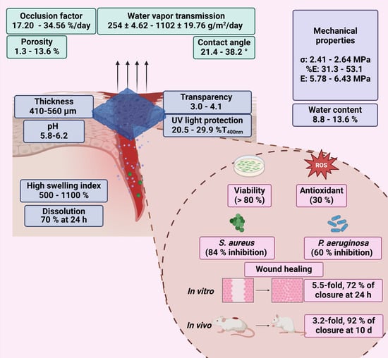 Wound healing is a complex process influenced by intrinsic and extrinsic factors like wound pH. The skin pH of chronic wounds is between 7.2 and 8.9 [48]; in most cases, an infection with a basic pH for bacteria ammonia production accompanies chronic wounds. Then, a wound bed equilibrium, decreasing pH (pH 3.2–5.4) with a wound dressing [58], could help to present antimicrobial effectiveness and fibroblast proliferation [59]. Our membranes presented a slightly acidic pH in the 5.80 ± 0.07–6.24 ± 0.07 range, and these values are compared and correspond with other biopolymeric wound dressings such as sodium alginate–curcumin nanoparticle (SA-CurNp) membranes with pH ranges of 5.65 ± 0.01–5.97 ± 0.05 [48] and sodium alginate–cannabidiol and cannabigerol nanoparticle films with pH values of 6–7 [59].