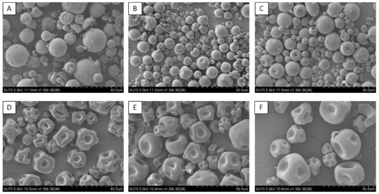 (A) SEM images of sample 1 spray-dried lysozyme at an atomisation gas flow rate of 473 L/h; (B) SEM images of sample 2 spray-dried lysozyme at an atomisation gas flow rate of 601 L/h; (C) SEM images of sample 3 spray-dried lysozyme at an atomisation gas flow rate of 742 L/h; (D) SEM images of sample 5 spray-dried lysozyme: trehalose 2:1 at an atomisation gas flow rate of 473 L/h; (E) SEM images of sample 8 spray-dried lysozyme: trehalose 2:1 at an atomisation gas flow rate of 601 L/h; and (F) SEM images of sample 11 spray-dried lysozyme: trehalose 2:1 at an atomisation gas flow rate of 742 L/h.