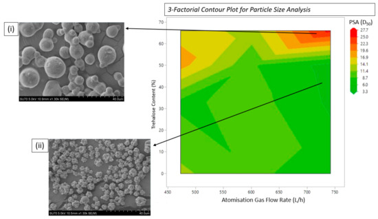 Understanding the interplay of processing parameters and particle size is critical in establishing the optimum processing conditions. Figure 2 shows a 3-factorial contour plot outlining particle size as a function of atomisation gas flow rate and trehalose concentration. The contour plot shows that while high atomisation gas flow rates are necessary for sub-5 µm particle sizes, careful consideration must be given to the excipient concentration. Trehalose concentrations of more than 50% of the total formulation increase particle sizes irrespective of atomisation gas flow rate, resulting in the particle size (D50) of the final formulation being quite large, ranging from ~5 to 26 µm (see Table 1: samples 4–12). The dark red region corresponds to the largest particle size, having a D50 average of ~26 µm and high particle agglomeration (Sample 12, lysozyme: trehalose 1:2 spray dried at 742 L/h), with the highest atomisation gas flow rate and trehalose to protein content. The dark green region has a particle size of <4 µm; both samples are spray-dried at the highest atomisation gas flow rate, however, the ratio of trehalose to protein has reduced.