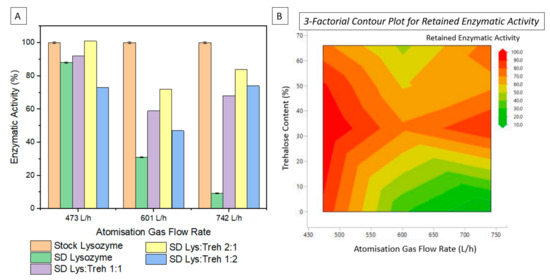 (A) Comparative graph of the retained activity of lysozyme before and after spray drying and with the addition of the excipient trehalose; (B) 3-factorial contour plot for retained enzymatic activity examining the effects of atomisation gas flow rate and trehalose content.