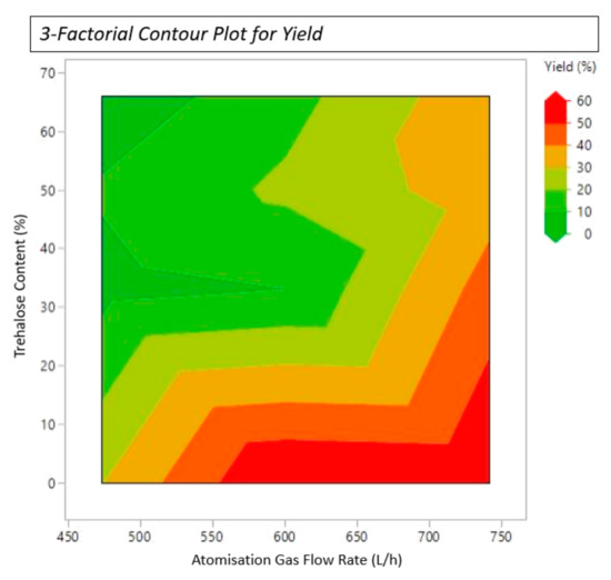 3-factorial contour plot for yield reflecting the effects of atomisation gas flow rate and trehalose content.
