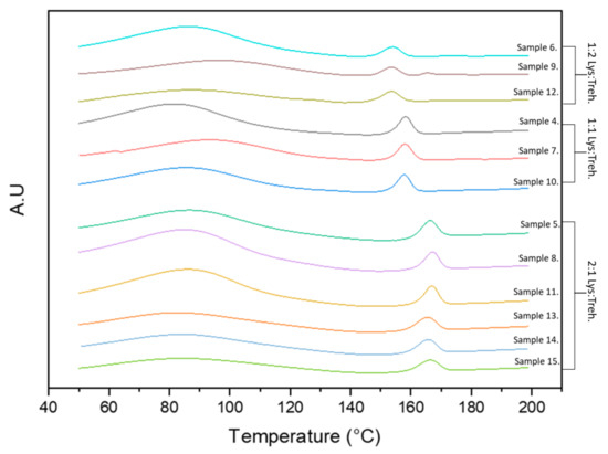 DSC was employed to assess the thermal transitions of the spray-dried formulations. Measurement of variations in melting temperature (Tm) can be used to determine the stability of a biotherapeutic–excipient formulation. Figure 5 below shows the DSC thermograms for each lysozyme–trehalose formulation (samples 4–15). The first endotherm exhibits a broad peak ranging from 50 to 110 °C, which can be attributed to the large internal heterogeneity and broad relaxation times of the protein samples [50]. The second endotherm (Tm) is observed from 155 to 165 °C, depending on the concentration of trehalose present in the sample. The curves for samples 6, 9, and 12 contain the lowest amounts of trehalose (lysozyme: trehalose 1:2, spray-dried at 473, 601, and 742 L/h, respectively) and exhibit a Tm ~153 °C. Trehalose in isolation typically exhibits a Tm at 117.5 °C. The curves for samples 4, 7, and 10 contain a 1:1 ratio of lysozyme to trehalose sugar (spray-dried at 473, 601, and 742 L/h, respectively). The trehalose content results in a shift of the Tm endotherm curve to ~158 °C, closer to the endotherm for native lysozyme (202.6 °C). The samples containing a 2:1 ratio (protein: sugar) exhibit the highest Tm values of ~167 °C. The higher the Tm, the more thermodynamically stable the protein is [51].