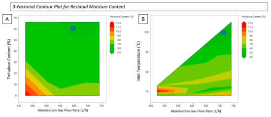 3-factorial contour plot for residual moisture content of the effect of (A) atomisation gas flow rate and trehalose content, and (B) atomisation gas flow rate and inlet temperature on the final residual moisture content of the spray-drying process. The blue dot in both graphs represents the optimum parameters to achieve the lowest moisture content.
