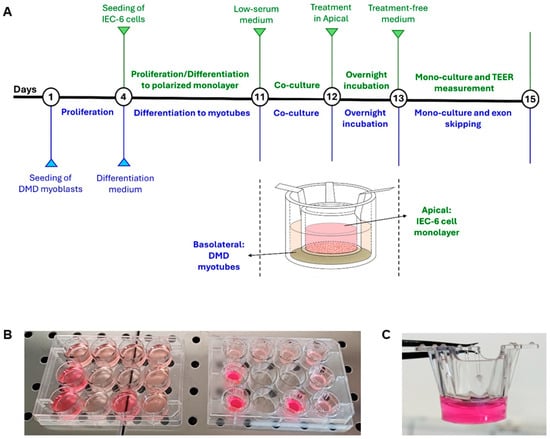 Immortalized myoblasts from a Duchenne muscular dystrophy (DMD) patient, were cultured in Skeletal Muscle Growth Medium (Promocell, Heidelberg, Germany). These cells were then induced to differentiate into myotubes by being incubated in Skeletal Muscle Differentiation Medium (Promocell, Heidelberg, Germany) for a minimum of 7 days at 37 °C with 5% CO2. Seven days after the start of differentiation of DMD myoblasts into myotubes, IEC-6 cells differentiated for 7 days in tight and polarized monolayers into 12-well inserts (1 µm pore size) were placed in 12-well plates containing myotubes. Skeletal Muscle differentiation medium (2 mL) in the basolateral compartment with myotubes and DMEM containing 1% FBS (0.4 mL) in the apical compartment with IEC-6 cells were conditioned for 24 h to define the relationship between muscle and intestinal cells under co-culture conditions. Thereafter, to evaluate if 5′-UDC-3′Cy3-ASO 51 can cross the intestinal barrier of IEC-6 cells and affect DMD myotubes, it was applied overnight at 37 °C and 5% CO2 into the apical compartment at the final concentration of 100 µM as free compound (gymnosis) or loaded in exosomes obtained from milk (MilkEXOs) in DMEM plus 0.1% bovine serum albumin (BSA). Indeed, exosomes normally present in FBS can interfere with exogenous milk-exosomes, thus previously reported options for medium depletion of FBS-derived exosomes include replacing FBS in the basal culture medium, supplemented with all nutrients and antibiotics, with BSA to optimize cell survival [47]. Mono-cultured DMD myotubes were incubated with MilkEXOs (10 µM 5′-UDC-3′Cy3-ASO 51) as positive control. TEER of IEC-6 cell monolayers was measured before and after the incubation period with 5′-UDC-3′Cy3-ASO 51 and compared to untreated IEC-6 cell monolayers, alone or co-cultured with DMD myotubes. At the end of the incubation with 5′-UDC-3′Cy3-ASO 51, the apical incubation medium was withdrawn and stored at 4 °C until the final quantification of 5′-UDC- 3′Cy3-ASO 51 by NanoDrop 1000 Spectrophotometer (ThermoFisher Scientific, Milan, Italy). Myotubes in the bottom of the wells were separated from the IEC-6 cells in the inserts, maintained for 48 h at 37 °C and 5% CO2, and analysed for their intake of the 5′-UDC-3′Cy3-ASO 51. Mono-cultured myotubes incubated with MilkEXOs (10 µM 5′-UDC-3′Cy3-ASO 51) were also maintained for 48 h at 37 °C and 5% CO2. The basolateral incubation medium was withdrawn and stored at 4 °C until the final quantification of 5′-UDC-3′Cy3-ASO 51 by NanoDrop 1000 Spectrophotometer (ThermoFisher Scientific, Milan, Italy). Untreated DMD myotubes co-cultured with IEC-6 cell monolayers were used as negative control for both 5′-UDC-3′Cy3-ASO 51 and exon skipping quantification. The experiment was performed in triplicate. The scheme of the co-culture procedure and images of the equipment used are shown in Figure 2.