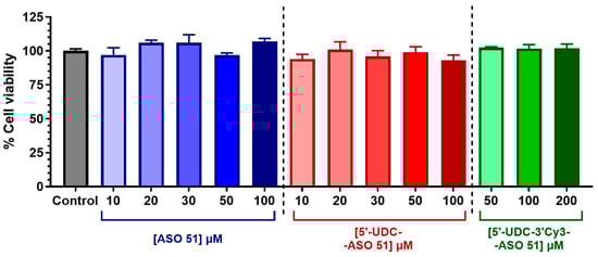 Cell viability of IEC-6 cells incubated overnight with different concentrations of ASO 51 (shades of blue), 5′-UDC-ASO 51 (shades of red) or 5′-UDC-3′Cy3-ASO 51 (shades of green). Results are reported as cell viability percentage (%) normalized to untreated control (in the absence of compounds). Data are expressed as mean ± S.E.M. of four independent experiments and were statistically analyzed by one-way ANOVA followed by Dunnett’s multiple comparisons test, showing no statistically significant differences in cell viability in the presence of compounds compared to untreated control.