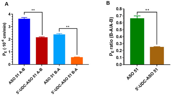 (A) Permeation coefficients (PE) of ASO 51 and 5′-UDC-ASO 51 across the intestinal monolayer of IEC-6 cells from apical to basolateral compartments (A–B) and vice versa (B–A). All data are reported as the mean ± S.E.M of three independent experiments. (B) PE ratio between efflux (B–A) and influx (A–B) permeation of ASO 51 and 5′-UDC-ASO 51 across the intestinal monolayer of IEC-6 cells. The values are reported as the mean ± S.E.M. of three independent experiments. ** p < 0.0001.
