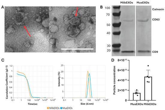 Exosome characterization. (A) Morphological characterization of isolated exosomes was carried out using TEM, (left) MusEXOs, (right) MilkEXOs. Scale bar: 200 nm. Red arrows indicate exosomes. (B) Western blot analysis of exosome-specific markers (CD9 and CD63) and the endoplasmic reticulum marker (calnexin) was performed from exosomal protein extracts. (C) Size distribution of isolated exosomes measured using Zetasizer Ultra red instrument (Malvern Panalytical). The analysis produced a correlogram (left) and showed a distribution in the size of isolated exosomes with defined peaks and absence of polydispersity (right). (D) Particle concentration was evaluated by particle count, using the Zetasizer Ultra Red Instrument (Malvern Analytical). Each dot represents a different extraction of exosomes from the same initial amount of sample.