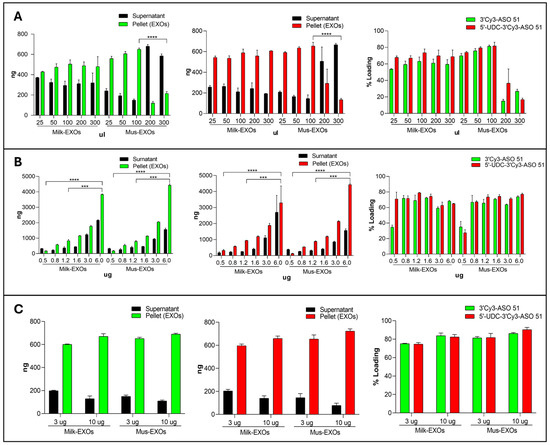 Co-incubation loading studies to identify the best ratio of ASOs and EXOs to achieve the highest loading efficiency. (A) Evaluation of the effect of different co-incubation volumes on loading efficiency. Different volumes (25, 50, 100 200 and 300 μL) of PBS were tested by mixing 3 μg of Milk-EXOs and Mus-EXOs with 800 ng of 5′-UDC-3′Cy3-ASO 51 (red) or 3′-Cy3-ASO 51 (green); (B) Evaluation of the effect of different amounts of ASOs on loading efficiency: 3 μg of Milk-EXOs and Mus-EXOs were mixed with 500, 800, 1200, 1600, 3000 and 6000 ng of 5′-UDC-3′Cy3-ASO 51 (red) or 3′Cy3-ASO 51 (green) for a ratio of 6:1, 3.75:1 2.5:1, 1.87:1, 1:1 and 1:2; (C) Evaluation of the effect of different quantity of EXOs on loading efficiency: 3 and 10 μg of Milk-EXOs and Mus-EXOs with 800 ng of 5′-UDC-3′Cy3-ASO 51 (red) or 3′Cy3-ASO 51 (green) in 100 μL of filtered 1X PBS. SUR-NATANT: ASOs quantified in the supernatant (BLACK); PELLET: ASOs quantified in the pellet, then loaded into the exosomes (GREEN: 3′Cy3-ASO 51; RED 5′-UDC-3′Cy3-ASO 51). Values are expressed as the mean ± standard deviation (SD) of three experiments. *** p < 0.0002 paired t-test, ordinary one-way ANOVA and two-way ANOVA multiple comparisons; **** p < 0.0001 paired t-test, ordinary one-way ANOVA and two-way ANOVA multiple comparisons.