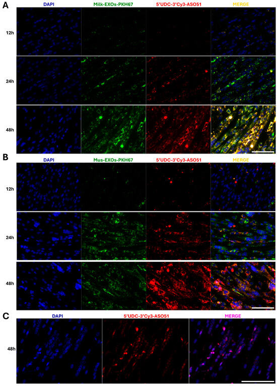 Related to this, Milk-EXOs and Mus-EXOs were labeled with the fluorescent green dye PKH67, loaded with 5′-UDC-3′Cy3-ASO 51, and then administered to myotubes differentiated from immortalized myoblasts with a deletion of exon 52, with the aim of confirming the ability to fuse with target cells and assessing the capacity of delivery ASOs. We monitored the fusion of complexes with cells at various time points (12, 24 and 48 h) to track their distribution. The results revealed that fluorescence was predominantly distributed within cells and exhibited a significant increase with time in both cases (Figure 7A,B), indicating the potential for exosomes to merge with target cells.