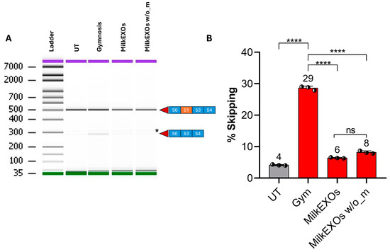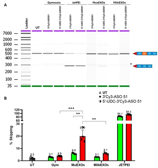 The skipping efficiency of MusEXOs-5′-UDC-3′Cy3-ASO 51 complexes was 20%, compared to 6% achieved with MusEXOs-3′Cy3-ASO 51 complexes. Only 6.1% of skipping was revealed with MilkEXOs-5′UDC-3′Cy3-ASO 51 complexes compared to 3.1% achieved with MilkEXOs-3′Cy3-ASO 51 complexes. Gymnotic delivery induced 3.9% and 3.1% with 5′-UDC-3′Cy3-ASO 51 and 3′Cy3-ASO 51, respectively (Figure 8B).
