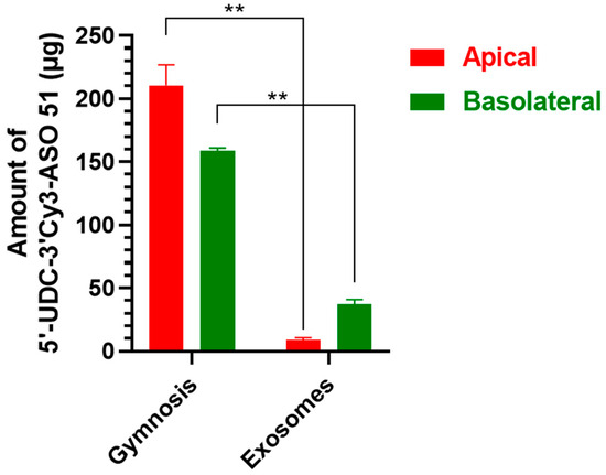 Figure 10 reports the amounts of 5′-UDC-3′Cy3-ASO 51 quantified by NanoDrop Spectrophotometry at the end of the experiment in the co-culture conditions, applying 100 µM 5′-UDC-3′Cy3-ASO 51 (400 µg) on the apical side of the system in gymnotic delivery or as MilkEXOs.
