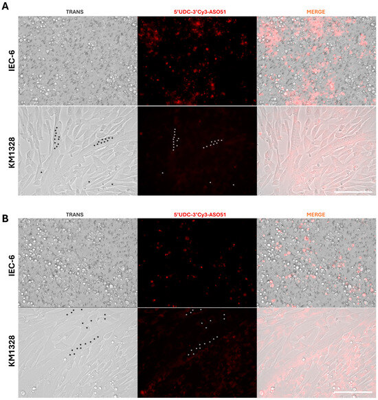 In our case, the experiment was performed by incubating 5′-UDC-ASO 51 conjugated to a fluorescent probe, i.e., 5′-UDC-3′Cy3-ASO 51, since the presence of the Cy3 dye was necessary to localize the ASO inside intestinal and muscle cells.