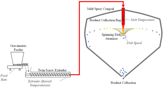 Process flow diagram of the melt spray congeal process. The red designates the heated path the melt follows from the extruder to the atomization disk. The cartoon depicts the droplets atomizing from the disk and cooling to the point of congealing, indicated by the color changing from yellow to blue, prior to impacting the collection bag.