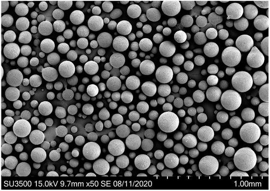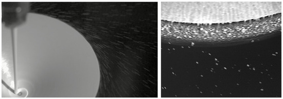 Rotary atomization is utilized in the MSC process as it has the ability to process viscous, highly loaded suspensions and produce droplets with a tight size distribution. Atomization dynamics for suspensions have been studied, and particle size models have been proposed in the literature [21]. These models were leveraged during process development to design a robust atomization operating space. An example image of the rotary atomization is provided in Figure 2 and Supplemental Video S1. Particles produced as a result of the MSC process are highly spherical, as illustrated in Figure 3.