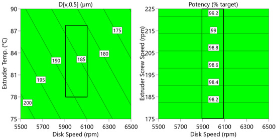 Particle size (D[v,0.5] (µm)) (left) as a function of the two statistically significant process parameters. Potency (right) as a function of the one statistically significant process parameter (extruder screw speed). The black boxes in both figures denote the narrowed operating space to ensure consistent microsphere particle size. Note: Supplement Table S1 reports the study design.