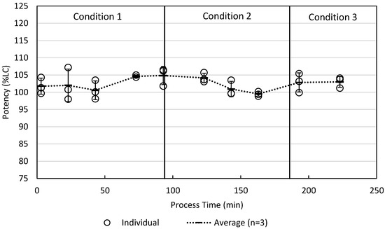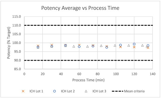 Potency across three registrational stability batches of uncoated microspheres as a function of process time.