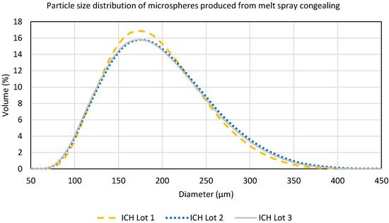 Particle size distribution by laser diffraction for registrational stability lots of uncoated microspheres produced via melt spray congealing prior to screening.