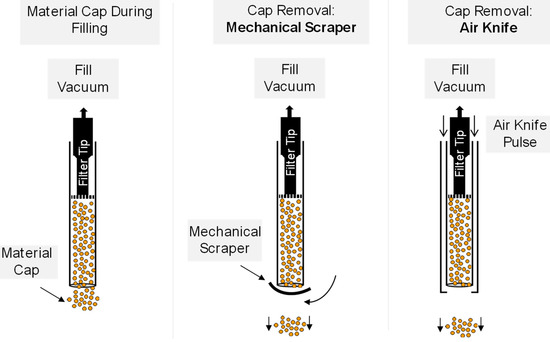 The interaction effect identified in the statistical model between (A) air knife pressure and (C) fill vacuum can be tied back to the physical situation occurring at the tip of the volumetric dosator. During cap removal (Figure 9), the fill vacuum is continuously pulling the microspheres into the dosator to keep them from dropping out. The air knife pulse must overcome the fill vacuum in order to remove the excess material (cap) from the tip of the dosator. There are scenarios where either not enough or too much material will be removed from the tip of the dosator with certain combinations of fill vacuum and air knife pressure set-points, increasing the variability in the fill contents (RSD). For example, a more negative fill vacuum setting and low air knife pressure may leave excess material on the tip of the dosator because the air knife pressure cannot overcome the fill vacuum.