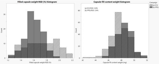 A comparison between the Registration Stability (referred to as ICH batches in the following figures) campaign manufactured with the mechanical scraper and the Process Performance Qualification (PPQ) campaign manufactured with the air knife set-up is shown in Figure 8. Filled capsule weight RSD (Figure 8, left) summarizes in-process samples taken during the encapsulation batch every 15 min. In total, 72 capsules are weighed, and the RSD is reported to compare against a process limit. Capsule fill content weight (Figure 8, right) summarizes the fill mass of coated microspheres from extended uniformity of dosage units sampling. The authors use the term extended uniformity to describe the statistical sampling plan for demonstrating the uniformity of dosage units [22]. This technique consists of taking stratified samples of three capsules from pre-determined locations across a batch. The data in Figure 8 are a summary of the three ICH batches overlaid with the three PPQ batches. For both the filled capsule weight RSD and the capsule fill content, the air knife upgrades on the equipment significantly reduced the variability within the capsule population and improved the filling process.