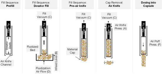 The encapsulator filling mechanism with the air knife upgrades is shown in Figure 9. The process is controlled through six process parameters: (A) air knife pressure, (B) infeed level, (C) fill vacuum, (D) fluidizing air flow rate, (E) fill speed, and (F) air puff pressure. In this process, coated microspheres are fed into a fluidized bed. The microspheres are maintained at a certain height, the infeed level (B). The level of fluidization is maintained through the fluidizing air flow rate (D). To start the encapsulation cycle, the dosator is filled by the fill vacuum parameter (C). The vacuum pulls material from the fluidized bed into the dosing tube. An air knife (A) utilizes compressed air to remove the excess material from the tip of the dosator. The coated microspheres are expelled from the dosator and into the capsule by mechanical actuation of the filter tip followed by a small burst of air called the air puff pressure (F). The encapsulation machine runs at a specified rate, fill speed (E), in capsules per hour.