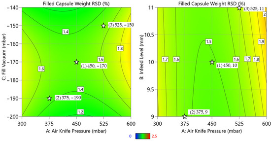 Contour plots for filled capsule weight RSD (%) (shown as values on the contour lines; color spectrum from blue (0%) to red (2.5%) for the RSD values is shown at the bottom of the figure) for the statistically significant two-way interaction effects of (1) AC: air knife pressure and fill vacuum (left) and (2) AB: air knife pressure and infeed level (right) based on DoE Study 2. The stars denote additional process exploration, as explained below in Section 4.3. Note: DoE Study 2 design and the results fitting and analysis are reported in Supplement Tables S3 and S4.