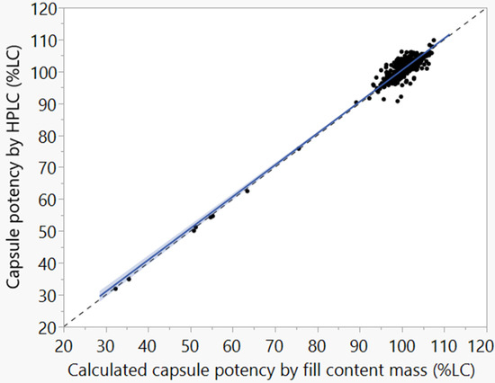 Capsule fill content uniformity for the ICH and PPQ campaigns, demonstrating the tight correlation between the fill content mass (X) and capsule assay (Y). Note that less than 2% of the capsules were less than 85 %LC and would be removed from the batch in the weight sorting process. Blue solid line: Y = 1.234 + 0.9921 × X (R2 = 0.943); Black dashed line: Y = X for reference.