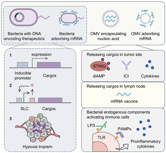 Bacterial surfaces have abundant motifs that can be modified to carry nucleic acid drugs. Target genes can also be introduced into the bacterial genome and can be translated upon reaching specific sites [87]. Bacteria as nucleic acid delivery systems for immunotherapy possess the following advantages: (i) immunostimulatory activity relieving TIME; (ii) tendency to colonize hypoxic tumors (anaerobic bacteria) enabling tumor targeting; and (iii) suitability for modifying genomes. The safety of bacteria can be improved by deleting pathogen-associated genes [88].