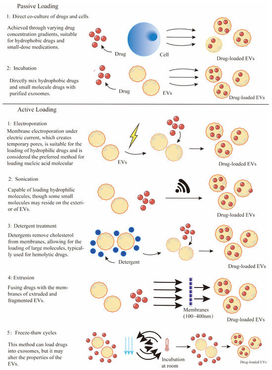 Post-loading methods are exogenous cargo loading strategies that involve the direct loading of exogenous cargo into EVs after the isolation of EVs. These strategies are mainly divided into passive loading and active loading methods. The commonly used post-loading approaches consist of direct incubation, transfection, electroporation, sonication, extrusion, and freeze-thaw cycles [157].