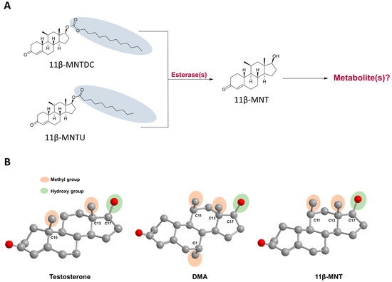 11β-Methyl-19-nortestosterone dodecylcarbonate (11β-MNTDC) and 11β-Methyl-19-nortestosterone undecanoate (11β-MNTU) are prodrugs metabolized by esterases into their active metabolite, 11β-Methyl-19-nortestosterone (11β-MNT) (A). Structural similarities amongst testosterone, dimethandrolone (DMA), and 11β-MNT (B). Red spheres in (B) indicate oxygen atom.