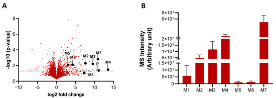 Volcano plot showing fold-differences and p-values of m/z features detected in a 2 h incubation of human hepatocytes with 11β-MNT as compared to the untreated (control) samples (A). P represents the parent active metabolite (11β-MNT); M1 and M3–M7, six identified metabolites; M2, four potential structural isomers. The black dotted line indicates −log10 (p-value, i.e., 1.33). Relative MS intensity of 11β-MNT metabolites in human hepatocyte incubation (B).