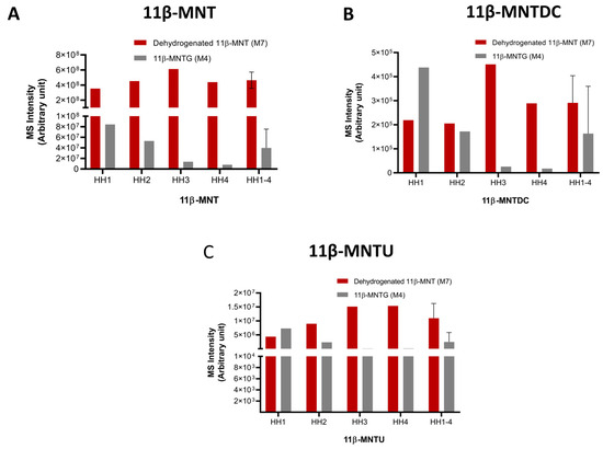 The levels of dehydrogenated 11β-MNT and 11β-MNTG formed in human hepatocyte incubations of 50 µM 11β-MNT (A) and 10 µM 11β-MNTU (B), and 11β-MNTDC (C). HH1–4: (Average of all four hepatocytes with SD). HH1 and HH2 represent UGT2B17 high expressors, whereas HH3 and HH4 are the null expressors of UGT2B17.