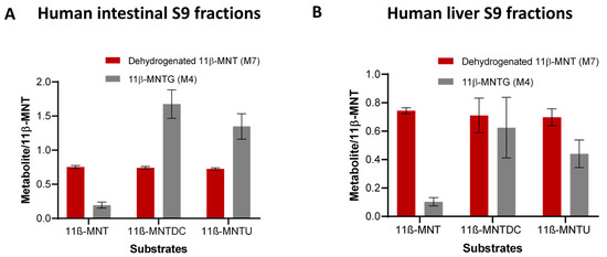 Only the dehydrogenation (M7) and glucuronidation (M4) products were detected when 11β-MNT, 11β-MNTDC, and 11β-MNTU were incubated in the human intestine (Figure 5A) and liver (Figure 5B) S9 fractions. The relative formation of these two metabolites was comparable between human liver S9 fractions and HH incubations (Figure 4A–C) with dehydrogenated metabolites being the prominent metabolic product. However, the formation of 11β-MNTG was significantly greater in the human intestinal S9 fractions when compared to the formation of dehydrogenated 11β-MNT.