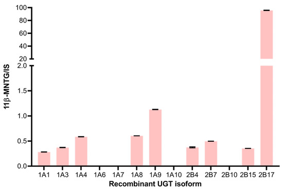 The intestinal S9 data were further complemented by the UGT reaction phenotyping assay. Out of the thirteen tested recombinant human UGTs, rUGT2B17 exhibited a major role in the conversion of 11β-MNT to 11β-MNTG (Figure 6). Although 11β-MNTG was also detected in rUGT1A4, rUGT1A8, rUGT1A9, and rUGT2B7 incubations, the relative intensity of the metabolite formed was <1% when compared to the rUGT2B17 incubation (Figure 6).