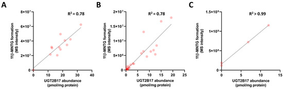 Correlation of UGT2B17 abundance and relative 11β-MNTG levels in HIMs (A), HLMs (B), and human hepatocytes (C).