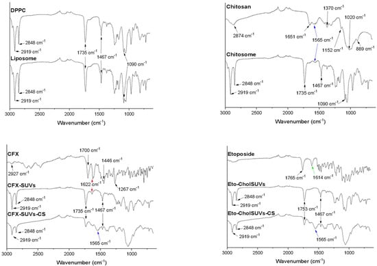 The ATR-FTIR spectra of DPPC, CFX, Eto, empty liposomes, empty CS-coated liposomes, CFX-SUVs, CFX-SUVs-CS, Eto-CholSUVs, and Eto-CholSUVs-CS are shown in Figure 1.