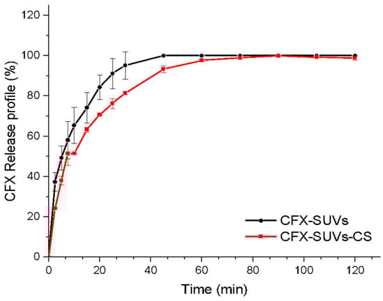 CFX-SUVs showed a 50% release after 5 min in the study conditions and reached 100% after 45 min (Figure 2). This is in contrast with the release profile of free CFX, which displayed a burst effect. On the other hand, the release from CS-coated liposomes was sustained in time and no burst effect was seen [29,58]. Half the encapsulated drug was released after 7.2 min, and the total of the encapsulated drug was released after 75 min instead of 45 min.