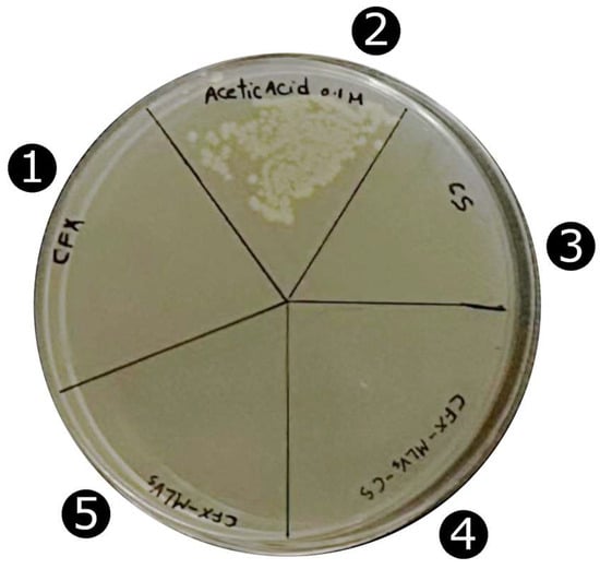 Antibacterial activity of CFX and its formulations. Ciprofloxacin (1), acetic acid 0.1 M (2), chitosan solution 0.3% (3), CFX-SUVs-CS (4), and CFX-SUVs (5).