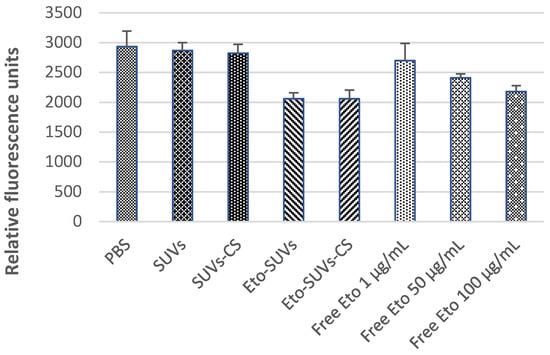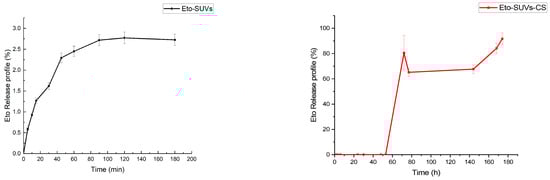 The entrapment efficiency for Eto-CholSUVs and Eto-CholSUVs-CS was found to be 94% and 96%, respectively. Thus, the CS-coating did not have a negative effect on Eto encapsulation. It has been previously described an increase in encapsulation efficiency after CS-coating liposomes containing food bioactives [72], in particular for those containing -OH groups, which showed a tendency to be more efficiently encapsulated by the effect of CS-coating due to an interaction between the -OH groups and -NH2 chitosan groups. A similar effect may be occurring via the etoposide’s two hydroxyl groups.
