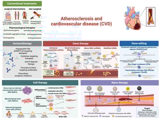 Graphic summary of the conventional and emerging therapies in atherosclerosis. Created with BioRender.com, accessed on 25 May 2024.