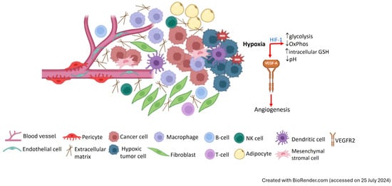 Despite tumor heterogeneity, the tumor microenvironment (TME) shares common features that contribute to cancer development [8,9]. Various cell types, including mesenchymal stromal cells (MSCs), tumor endothelial cells (TECs), pericytes, and infiltrating immune cells (lymphocytes, neutrophils, tumor-associated macrophages (TAMs), and mast cells) are found in the TME, which also includes cancer cells, cancer-associated fibroblasts (CAFs), and the extracellular matrix (ECM) [8,9].