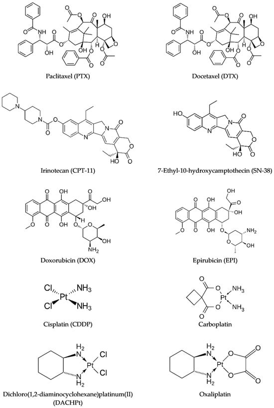 Moreover, most cytotoxic drugs in the clinic are highly hydrophobic (Figure 2), suffering from poor water solubility and low bioavailability, being administered as intravenous (IV) infusions (using body surface area dosing) at repeated, regular intervals (treatment cycles) to allow the recovery of normal tissues [13,15]. Nevertheless, neo-angiogenesis, dysfunctional tumor vasculature, increased interstitial fluid pressure, and efflux pumps, namely P-glycoprotein (P-gp), hinder intracellular therapeutic concentrations of cytotoxic drugs reaching the tumor site. The subtherapeutic drug availability in cancer cells can lead to the development of multidrug resistance (MDR), therefore a higher dose, often the maximum tolerated dose (MTD), is usually applied, causing systemic toxicity and potential severe AEs [13,15].