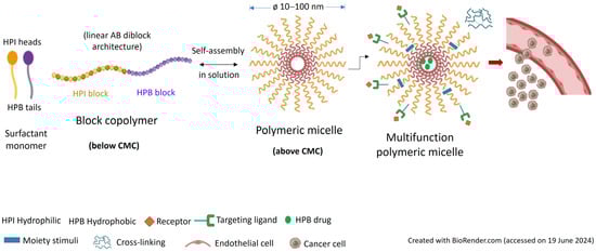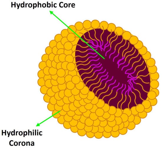 Polymeric micelles (PMs) are spherical-shaped nanostructures with sizes typically ranging from 10 to 100 nm, formed by spontaneous self-assembly of amphiphilic block copolymers in an aqueous environment when the concentration reaches a critical value, known as the critical micelle concentration (CMC) [21,22]. PMs have a unique core–shell structure with the hydrophobic blocks forming an inner core surrounded by a shell of hydrophilic blocks creating a protecting layer (corona) at the micelle–water interface (Figure 3). The hydrophobic effect is the main driving force for the self-assembly process, which lowers the Gibbs energy of the system by removing the hydrophobic blocks from the aqueous milieu [21,22].