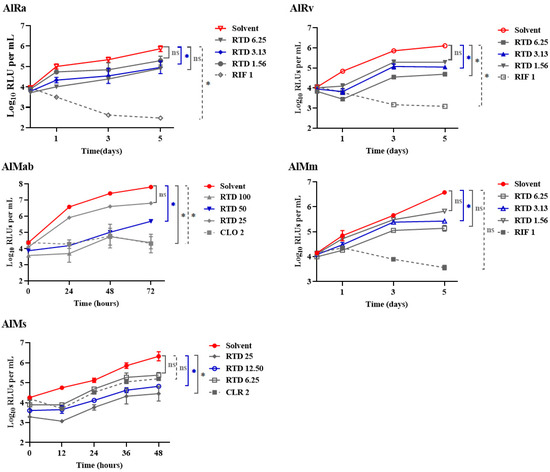 Time-killing curves of different mycobacteria treated with RTD. AlRa, autoluminescent M. tuberculosis H37Ra; AlRv, autoluminescent M. tuberculosis H37Rv; AlMm, autoluminescent M. marinum; AlMab, autoluminescent M. abscessus; AlMs, autoluminescent M. smegmatis; Solvent, dimethyl sulfoxide; RTD, rupatadine; RIF, rifampicin; CLO, clofazimine; CLR, clarithromycin; ns, p > 0.05; *, p < 0.05. The numbers following compounds indicate the corresponding concentrations (μg/mL).