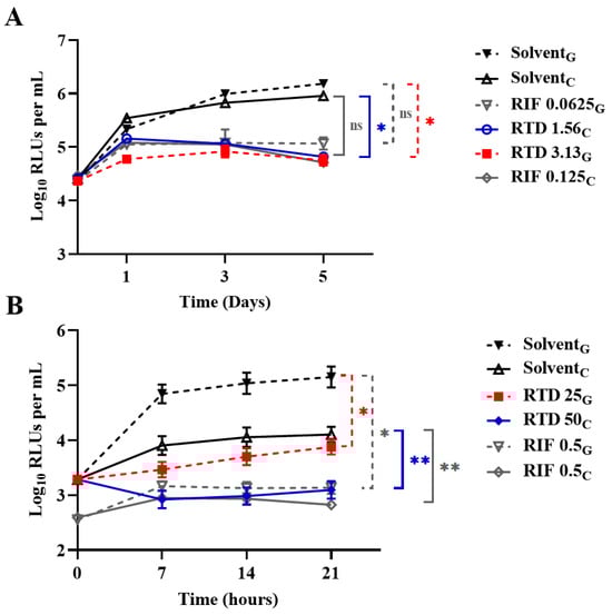 Time-killing curves of replicating AlRa or recovering curves of nonreplicating AlRa treated with RTD in diverse media. (A) Aerobic conditions; (B) anaerobic conditions. Solvent, dimethyl sulfoxide; RTD, rupatadine; RIF, rifampicin; ns, p > 0.05; *, p < 0.05; **, p < 0.01; G, 7H9 enriched with glycerol; C, 7H9 enriched with cholesterol. The numbers following RTD or RIF indicate the corresponding concentrations (μg/mL).
