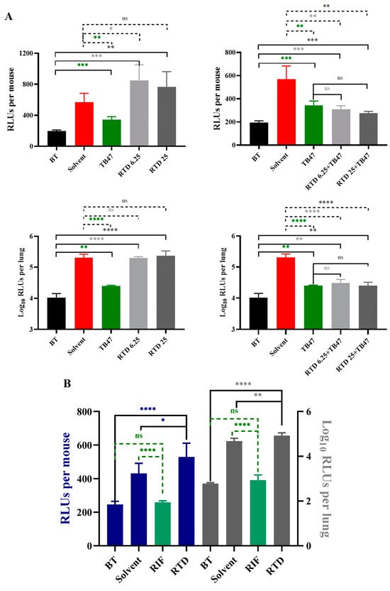 In vivo evaluation of RTD was conducted using the oral administration method first, as RTD is an oral drug, with the dosages of 6.25 and 25 mg/kg. However, the results indicated that RTD did not exhibit in vivo activity against M. tuberculosis even at the highest dosage of 25 mg/kg (Figure 3A). The live mice RLUs of the combination of RTD with TB47 were slightly lower than those of the TB47-alone group (Figure 3A, p > 0.05). However, the RLUs of lung suspension showed no significant difference between the combination of RTD with TB47 and the TB47-alone groups (Figure 3A, p > 0.05).